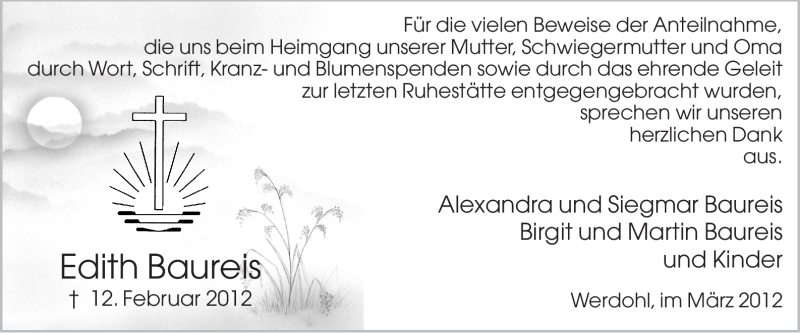 Hier finden Sie alle Traueranzeigen aus der Zeitung, die bisher für Edith Baureis erschienen sind. Weitere Traueranzeigen, die in der Zeitung erscheinen, werden hier ebenfalls aufgelistet