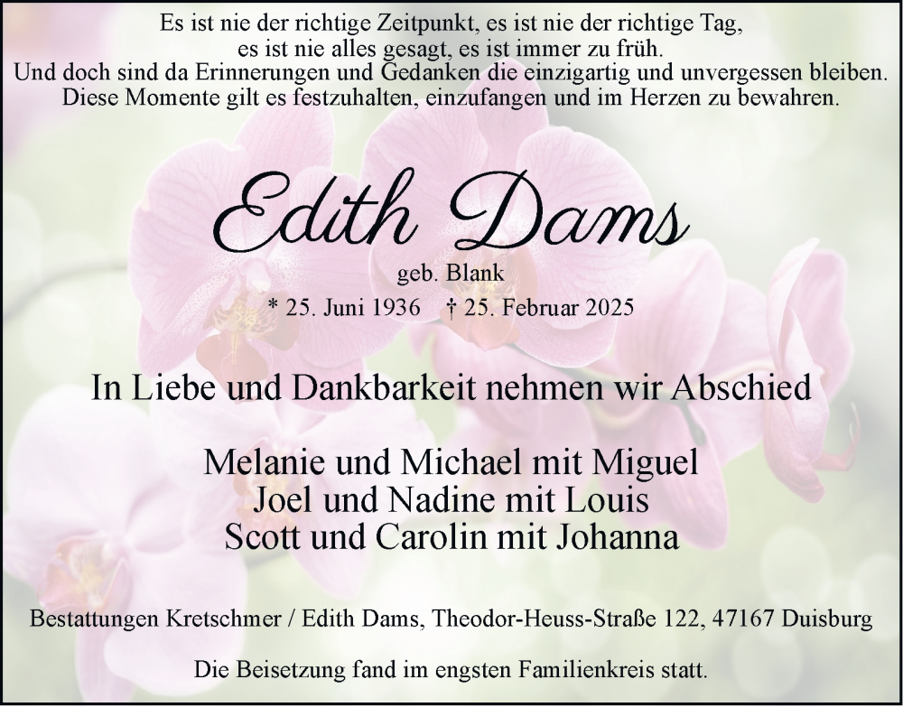 Hier finden Sie alle Traueranzeigen aus der Zeitung, die bisher für Edith Dams erschienen sind. Weitere Traueranzeigen, die in der Zeitung erscheinen, werden hier ebenfalls aufgelistet