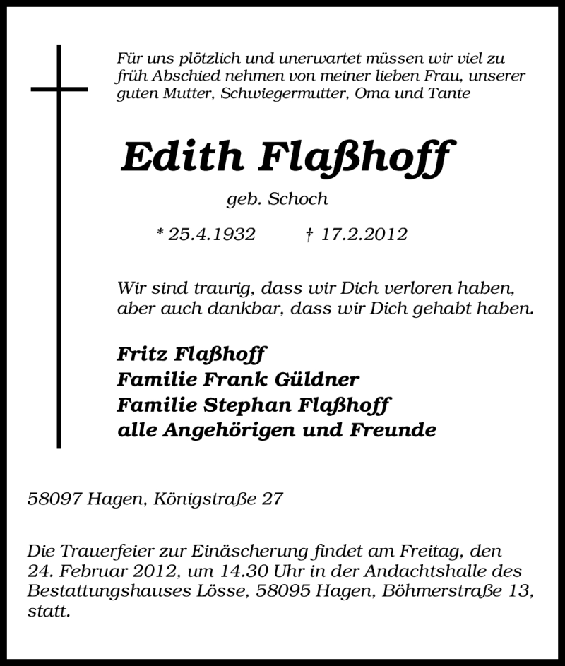 Hier finden Sie alle Traueranzeigen aus der Zeitung, die bisher für Edith Flaßhoff erschienen sind. Weitere Traueranzeigen, die in der Zeitung erscheinen, werden hier ebenfalls aufgelistet