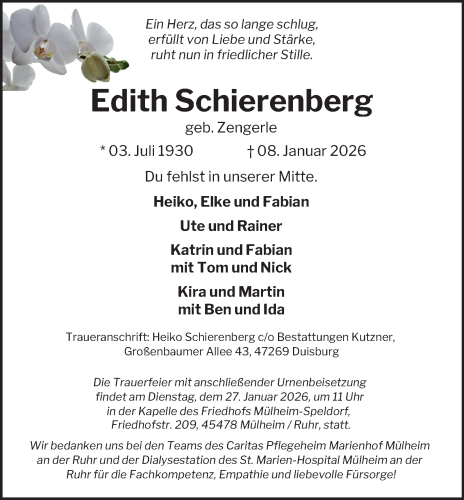 Hier finden Sie alle Traueranzeigen aus der Zeitung, die bisher für Edith Schierenberg erschienen sind. Weitere Traueranzeigen, die in der Zeitung erscheinen, werden hier ebenfalls aufgelistet