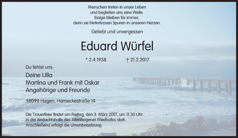 Hier finden Sie alle Traueranzeigen aus der Zeitung, die bisher für Eduard Würfel erschienen sind. Weitere Traueranzeigen, die in der Zeitung erscheinen, werden hier ebenfalls aufgelistet