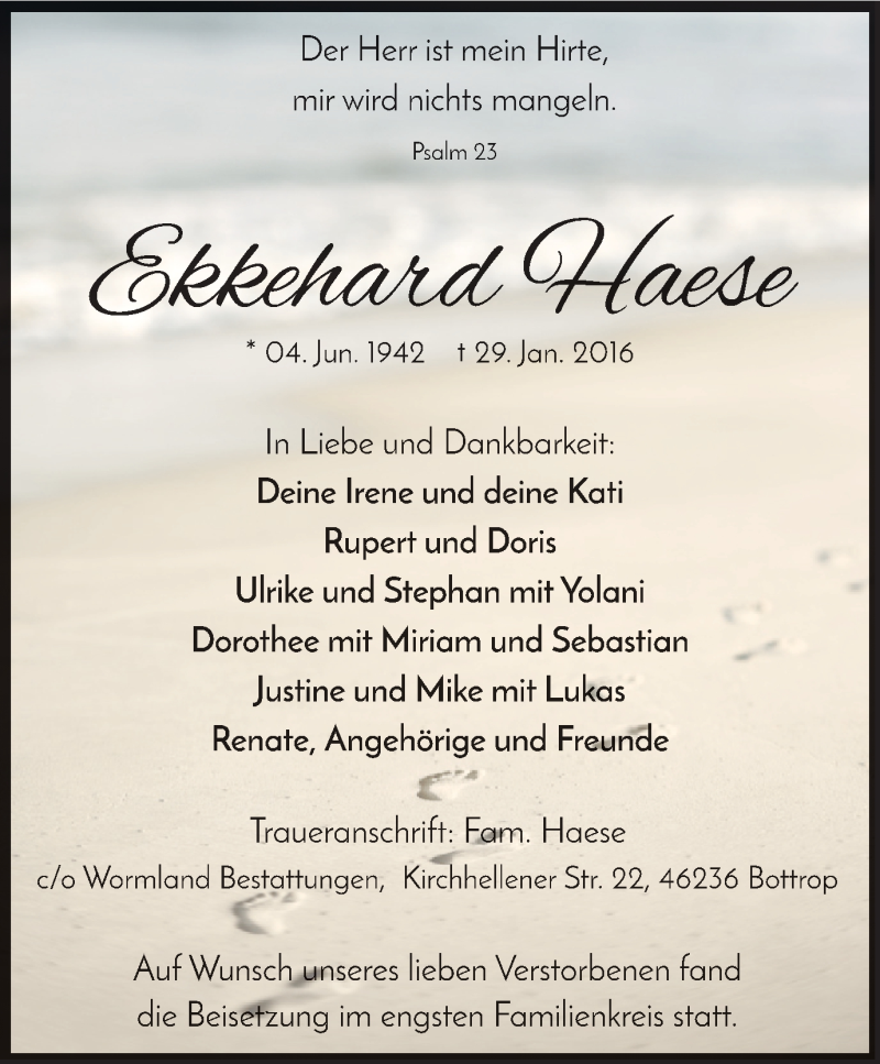 Hier finden Sie alle Traueranzeigen aus der Zeitung, die bisher für Ekkehard Haese erschienen sind. Weitere Traueranzeigen, die in der Zeitung erscheinen, werden hier ebenfalls aufgelistet