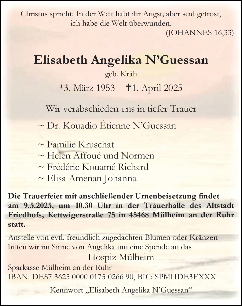 Hier finden Sie alle Traueranzeigen aus der Zeitung, die bisher für Elisabeth Angelika NGuessan erschienen sind. Weitere Traueranzeigen, die in der Zeitung erscheinen, werden hier ebenfalls aufgelistet