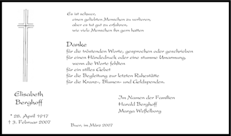 Hier finden Sie alle Traueranzeigen aus der Zeitung, die bisher für Elisabeth Berghoff erschienen sind. Weitere Traueranzeigen, die in der Zeitung erscheinen, werden hier ebenfalls aufgelistet
