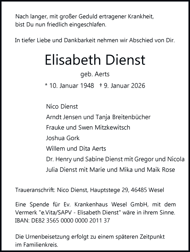 Hier finden Sie alle Traueranzeigen aus der Zeitung, die bisher für Elisabeth Dienst erschienen sind. Weitere Traueranzeigen, die in der Zeitung erscheinen, werden hier ebenfalls aufgelistet