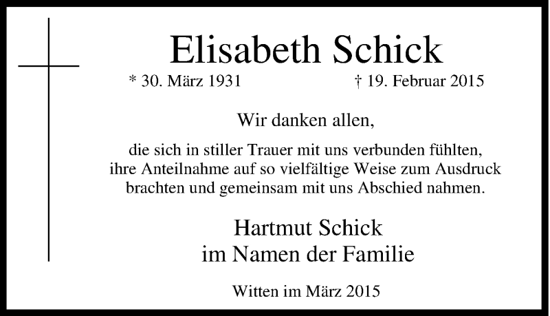 Hier finden Sie alle Traueranzeigen aus der Zeitung, die bisher für Elisabeth Schick erschienen sind. Weitere Traueranzeigen, die in der Zeitung erscheinen, werden hier ebenfalls aufgelistet