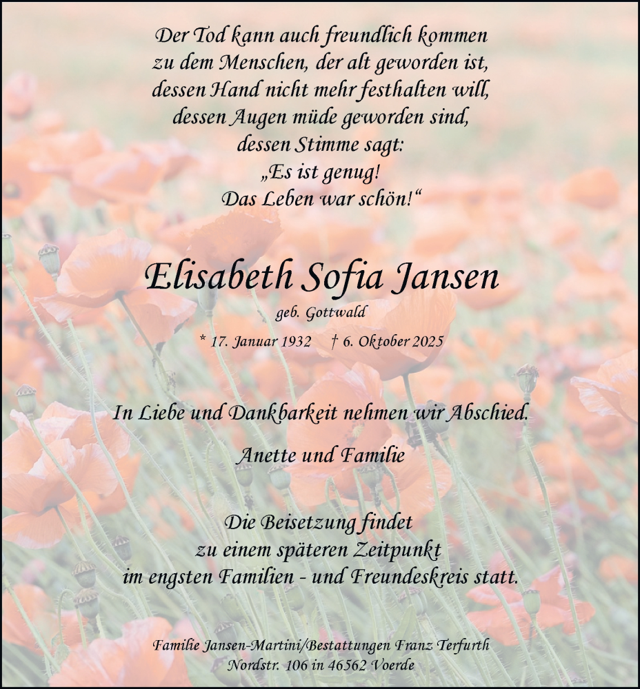 Hier finden Sie alle Traueranzeigen aus der Zeitung, die bisher für Elisabeth Sofia Jansen erschienen sind. Weitere Traueranzeigen, die in der Zeitung erscheinen, werden hier ebenfalls aufgelistet