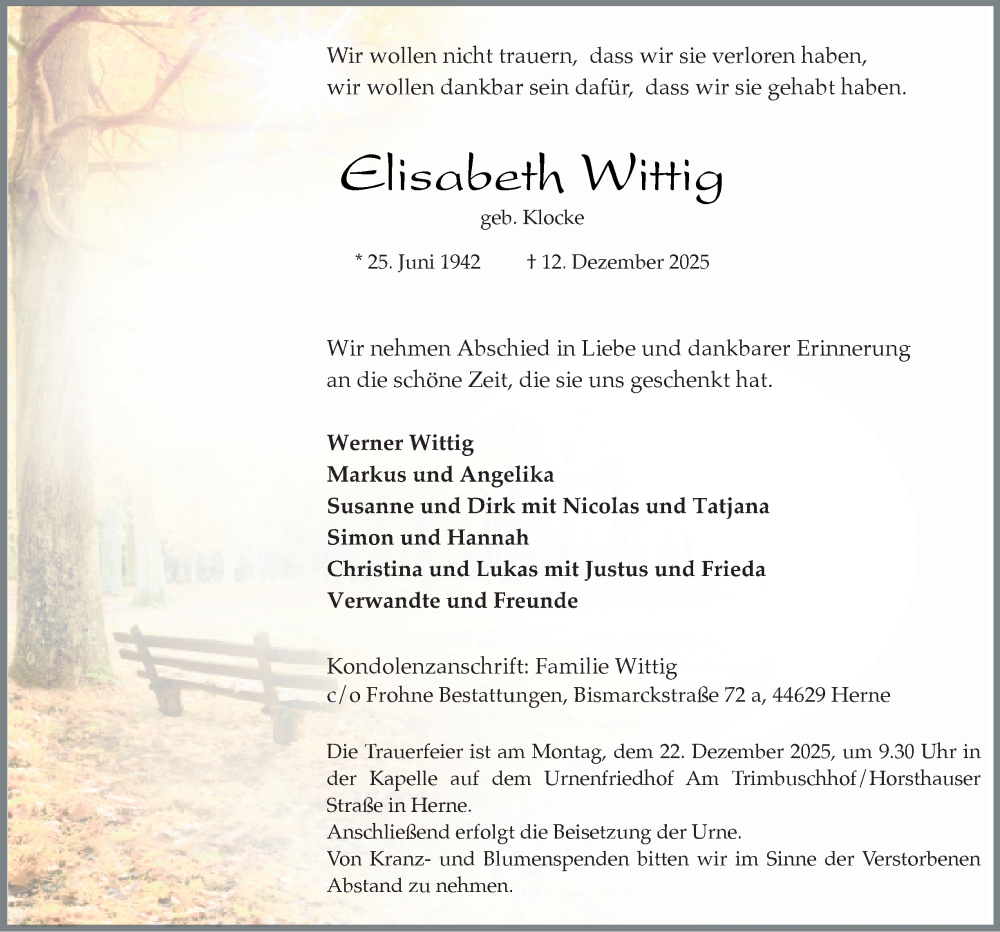 Hier finden Sie alle Traueranzeigen aus der Zeitung, die bisher für Elisabeth Wittig erschienen sind. Weitere Traueranzeigen, die in der Zeitung erscheinen, werden hier ebenfalls aufgelistet