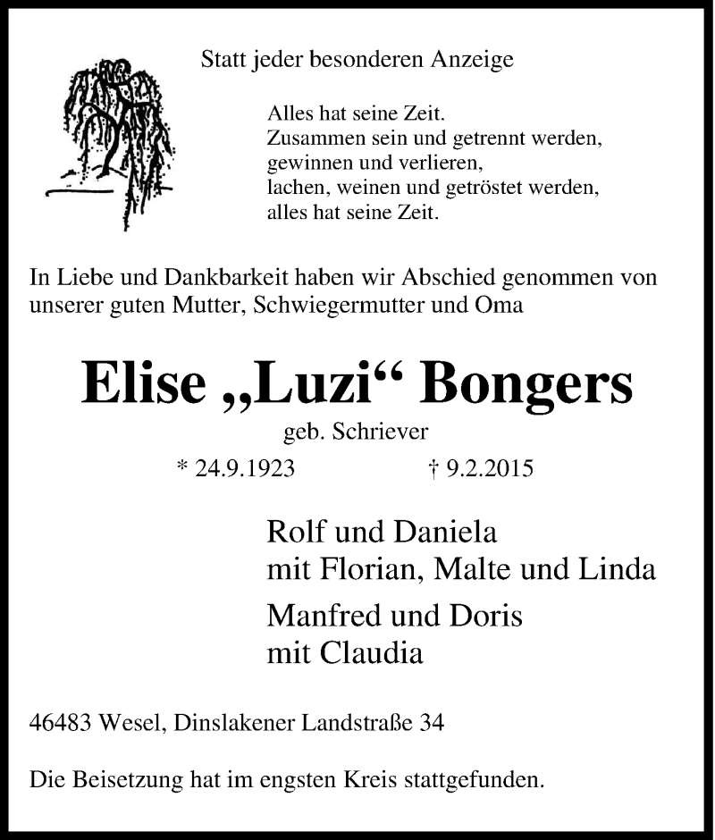 Hier finden Sie alle Traueranzeigen aus der Zeitung, die bisher für Elise Bongers erschienen sind. Weitere Traueranzeigen, die in der Zeitung erscheinen, werden hier ebenfalls aufgelistet