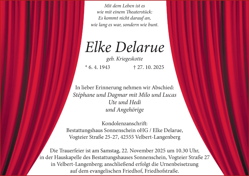 Hier finden Sie alle Traueranzeigen aus der Zeitung, die bisher für Elke Delarue erschienen sind. Weitere Traueranzeigen, die in der Zeitung erscheinen, werden hier ebenfalls aufgelistet