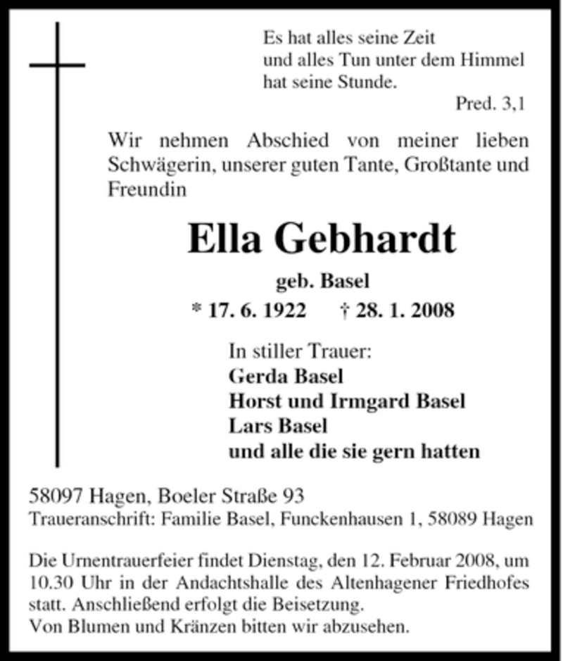 Hier finden Sie alle Traueranzeigen aus der Zeitung, die bisher für Ella Gebhardt erschienen sind. Weitere Traueranzeigen, die in der Zeitung erscheinen, werden hier ebenfalls aufgelistet