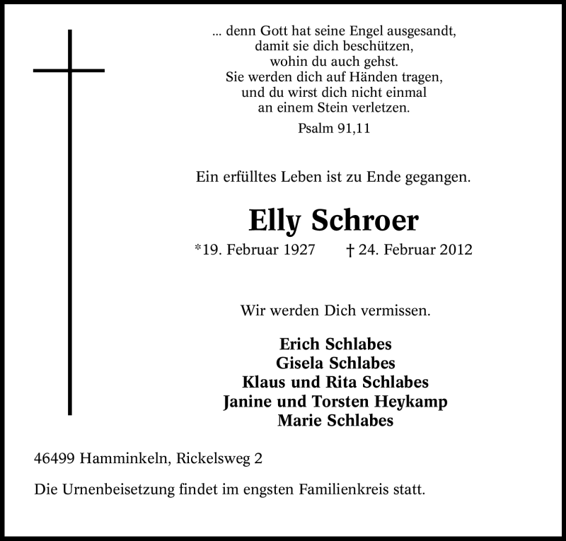 Hier finden Sie alle Traueranzeigen aus der Zeitung, die bisher für Elly Schroer erschienen sind. Weitere Traueranzeigen, die in der Zeitung erscheinen, werden hier ebenfalls aufgelistet