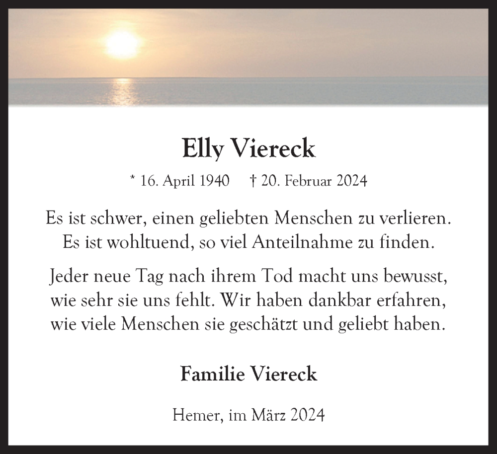 Hier finden Sie alle Traueranzeigen aus der Zeitung, die bisher für Elly Viereck erschienen sind. Weitere Traueranzeigen, die in der Zeitung erscheinen, werden hier ebenfalls aufgelistet