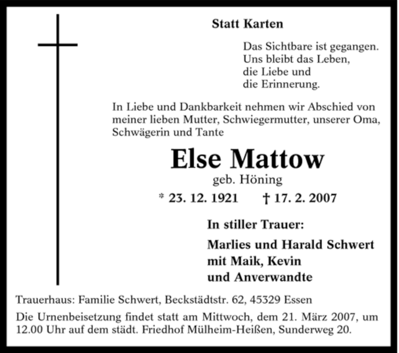 Hier finden Sie alle Traueranzeigen aus der Zeitung, die bisher für Else Mattow erschienen sind. Weitere Traueranzeigen, die in der Zeitung erscheinen, werden hier ebenfalls aufgelistet