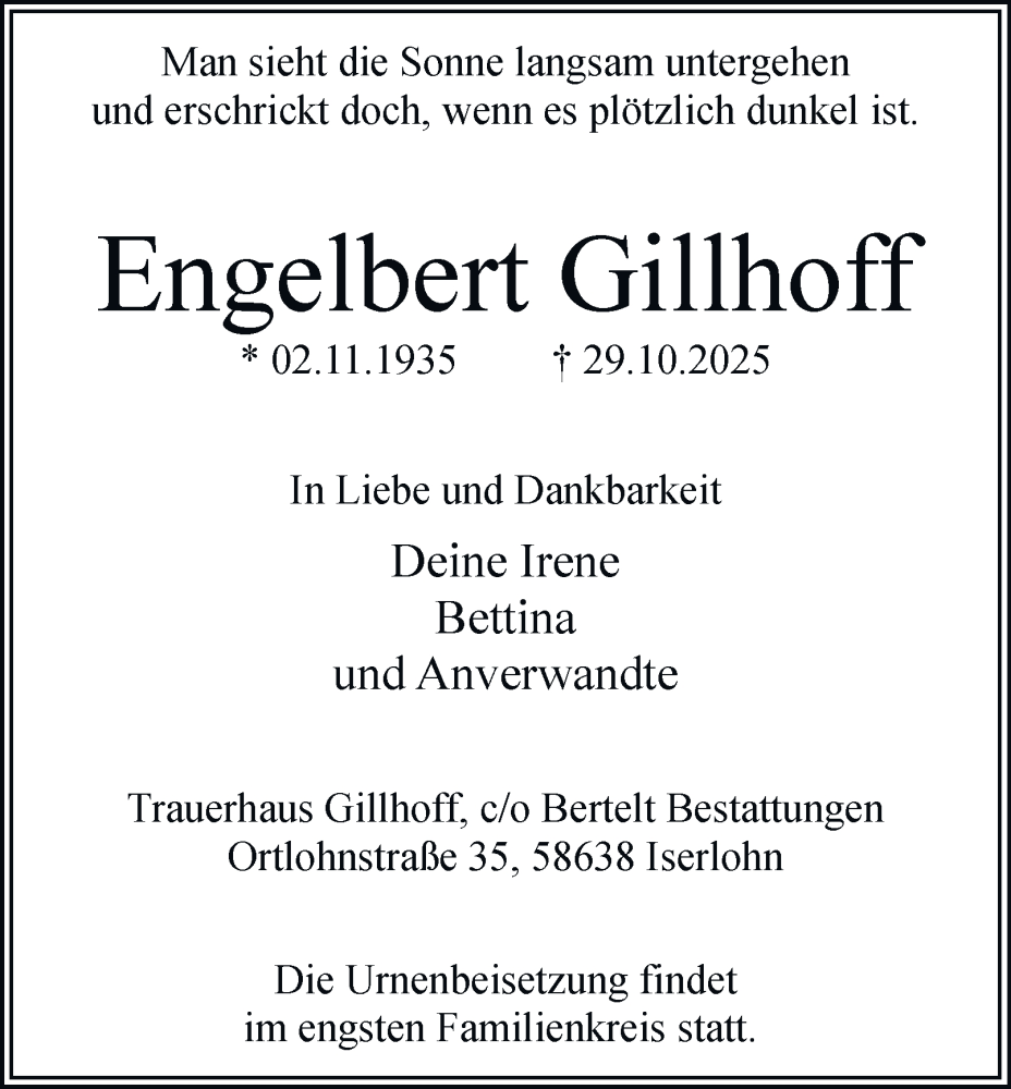 Hier finden Sie alle Traueranzeigen aus der Zeitung, die bisher für Engelbert Gillhoff erschienen sind. Weitere Traueranzeigen, die in der Zeitung erscheinen, werden hier ebenfalls aufgelistet
