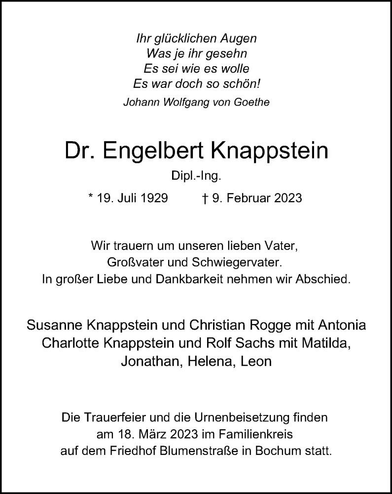 Hier finden Sie alle Traueranzeigen aus der Zeitung, die bisher für Engelbert Knappstein erschienen sind. Weitere Traueranzeigen, die in der Zeitung erscheinen, werden hier ebenfalls aufgelistet