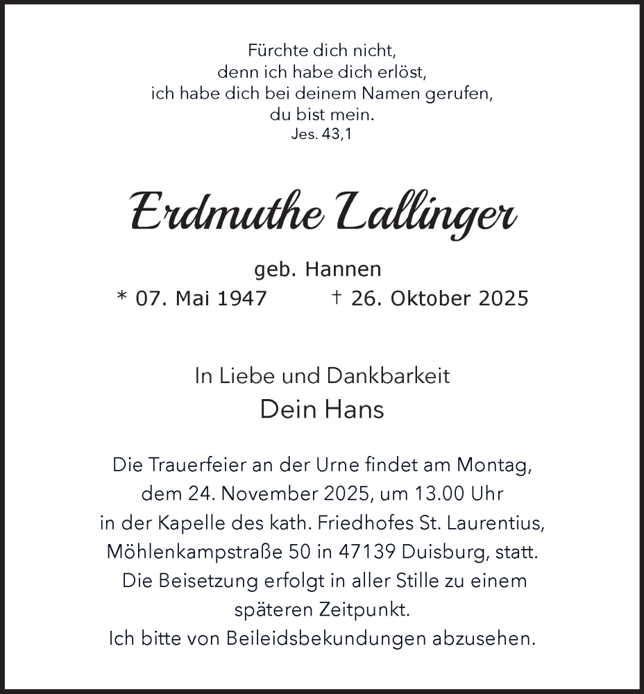Hier finden Sie alle Traueranzeigen aus der Zeitung, die bisher für Erdmuthe Lallinger erschienen sind. Weitere Traueranzeigen, die in der Zeitung erscheinen, werden hier ebenfalls aufgelistet