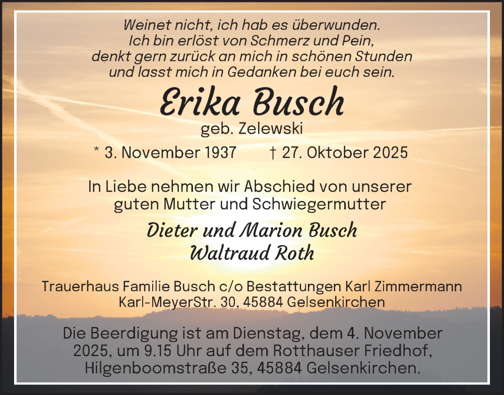 Hier finden Sie alle Traueranzeigen aus der Zeitung, die bisher für Erika Busch erschienen sind. Weitere Traueranzeigen, die in der Zeitung erscheinen, werden hier ebenfalls aufgelistet