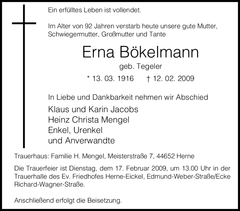 Hier finden Sie alle Traueranzeigen aus der Zeitung, die bisher für Erna Bökelmann erschienen sind. Weitere Traueranzeigen, die in der Zeitung erscheinen, werden hier ebenfalls aufgelistet