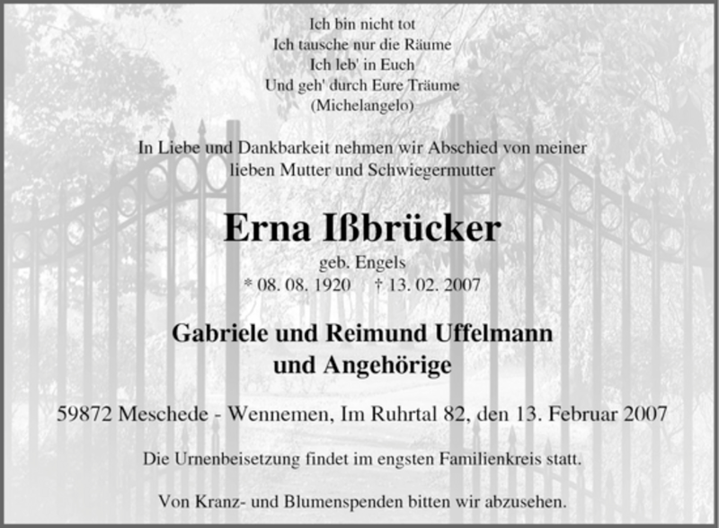 Hier finden Sie alle Traueranzeigen aus der Zeitung, die bisher für Erna Ißbrücker erschienen sind. Weitere Traueranzeigen, die in der Zeitung erscheinen, werden hier ebenfalls aufgelistet