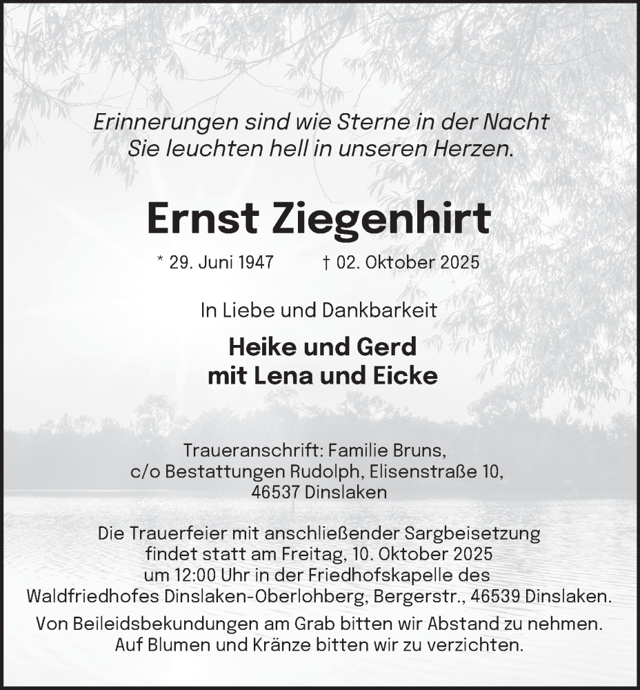 Hier finden Sie alle Traueranzeigen aus der Zeitung, die bisher für Ernst Ziegenhirt erschienen sind. Weitere Traueranzeigen, die in der Zeitung erscheinen, werden hier ebenfalls aufgelistet