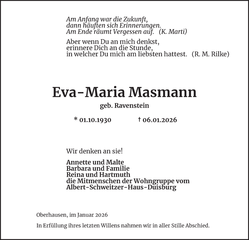 Hier finden Sie alle Traueranzeigen aus der Zeitung, die bisher für Eva-Maria Masmann erschienen sind. Weitere Traueranzeigen, die in der Zeitung erscheinen, werden hier ebenfalls aufgelistet
