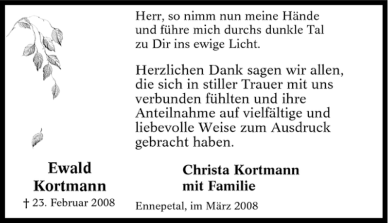 Hier finden Sie alle Traueranzeigen aus der Zeitung, die bisher für Ewald Kortmann erschienen sind. Weitere Traueranzeigen, die in der Zeitung erscheinen, werden hier ebenfalls aufgelistet
