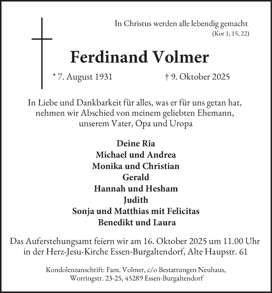 Hier finden Sie alle Traueranzeigen aus der Zeitung, die bisher für Ferdinand Volmer erschienen sind. Weitere Traueranzeigen, die in der Zeitung erscheinen, werden hier ebenfalls aufgelistet