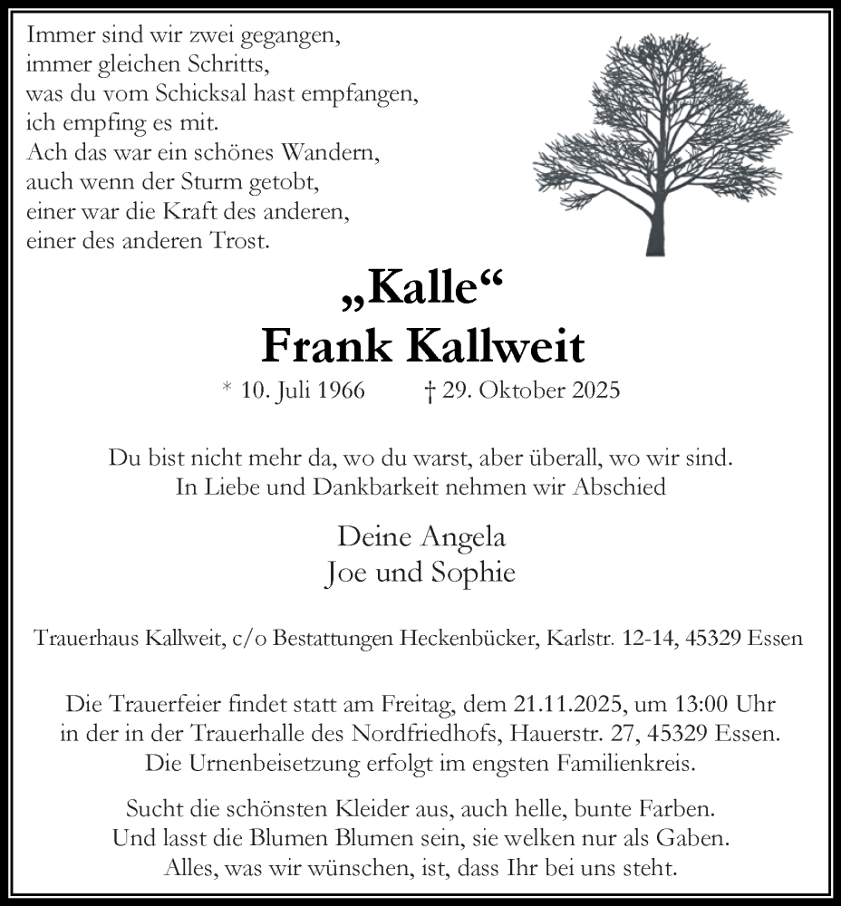 Hier finden Sie alle Traueranzeigen aus der Zeitung, die bisher für Frank Kallweit erschienen sind. Weitere Traueranzeigen, die in der Zeitung erscheinen, werden hier ebenfalls aufgelistet