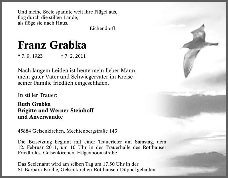 Hier finden Sie alle Traueranzeigen aus der Zeitung, die bisher für Franz Grabka erschienen sind. Weitere Traueranzeigen, die in der Zeitung erscheinen, werden hier ebenfalls aufgelistet