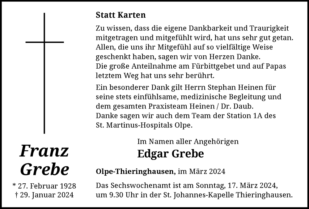 Hier finden Sie alle Traueranzeigen aus der Zeitung, die bisher für Franz Grebe erschienen sind. Weitere Traueranzeigen, die in der Zeitung erscheinen, werden hier ebenfalls aufgelistet
