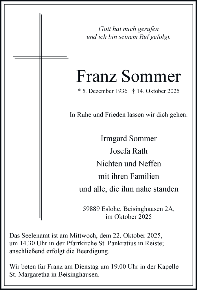 Hier finden Sie alle Traueranzeigen aus der Zeitung, die bisher für Franz Sommer erschienen sind. Weitere Traueranzeigen, die in der Zeitung erscheinen, werden hier ebenfalls aufgelistet