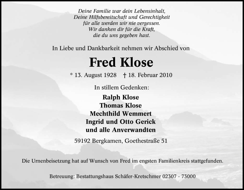 Hier finden Sie alle Traueranzeigen aus der Zeitung, die bisher für Fred Klose erschienen sind. Weitere Traueranzeigen, die in der Zeitung erscheinen, werden hier ebenfalls aufgelistet