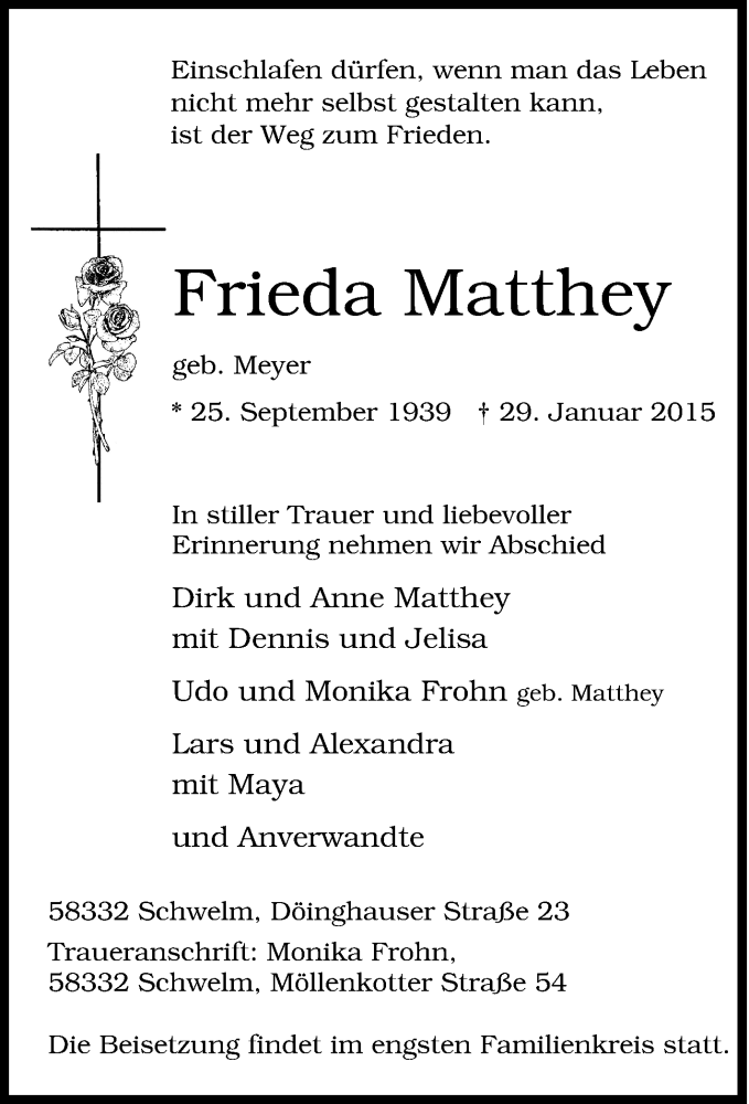 Hier finden Sie alle Traueranzeigen aus der Zeitung, die bisher für Frieda Matthey erschienen sind. Weitere Traueranzeigen, die in der Zeitung erscheinen, werden hier ebenfalls aufgelistet