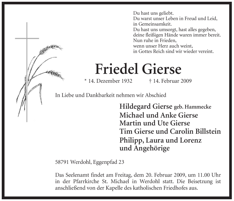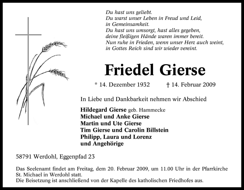 Hier finden Sie alle Traueranzeigen aus der Zeitung, die bisher für Friedel Gierse erschienen sind. Weitere Traueranzeigen, die in der Zeitung erscheinen, werden hier ebenfalls aufgelistet