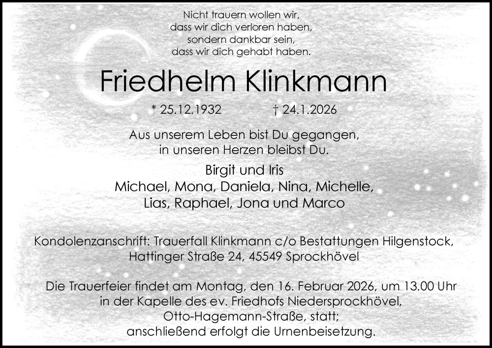 Hier finden Sie alle Traueranzeigen aus der Zeitung, die bisher für Friedhelm Klinkmann erschienen sind. Weitere Traueranzeigen, die in der Zeitung erscheinen, werden hier ebenfalls aufgelistet