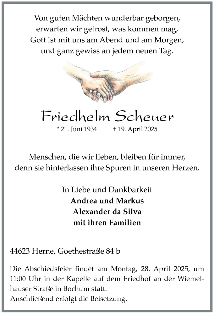 Hier finden Sie alle Traueranzeigen aus der Zeitung, die bisher für Friedhelm Scheuer erschienen sind. Weitere Traueranzeigen, die in der Zeitung erscheinen, werden hier ebenfalls aufgelistet