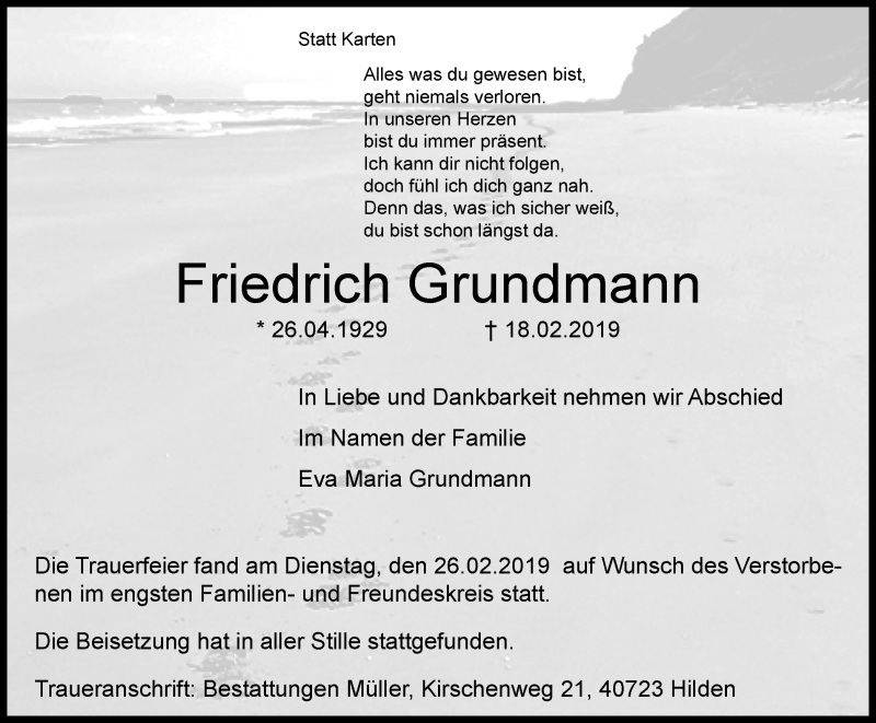 Hier finden Sie alle Traueranzeigen aus der Zeitung, die bisher für Friedrich Grundmann erschienen sind. Weitere Traueranzeigen, die in der Zeitung erscheinen, werden hier ebenfalls aufgelistet