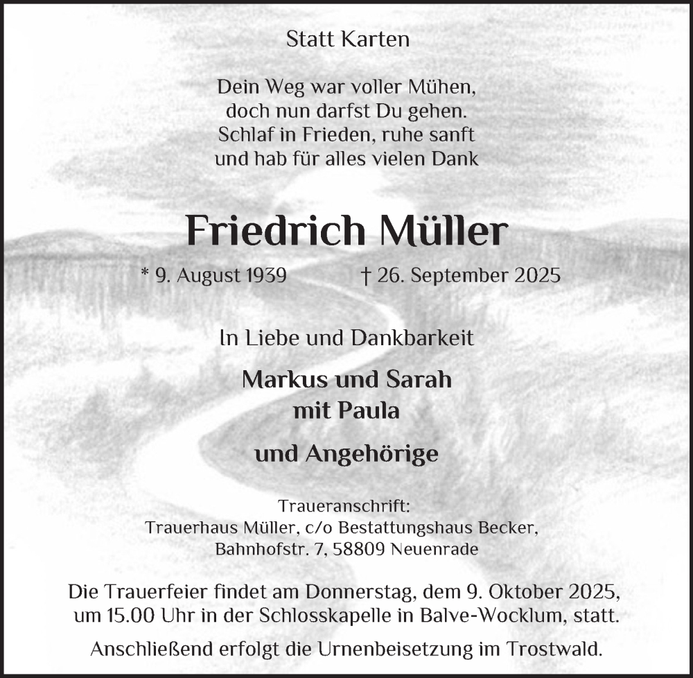 Hier finden Sie alle Traueranzeigen aus der Zeitung, die bisher für Friedrich Müller erschienen sind. Weitere Traueranzeigen, die in der Zeitung erscheinen, werden hier ebenfalls aufgelistet