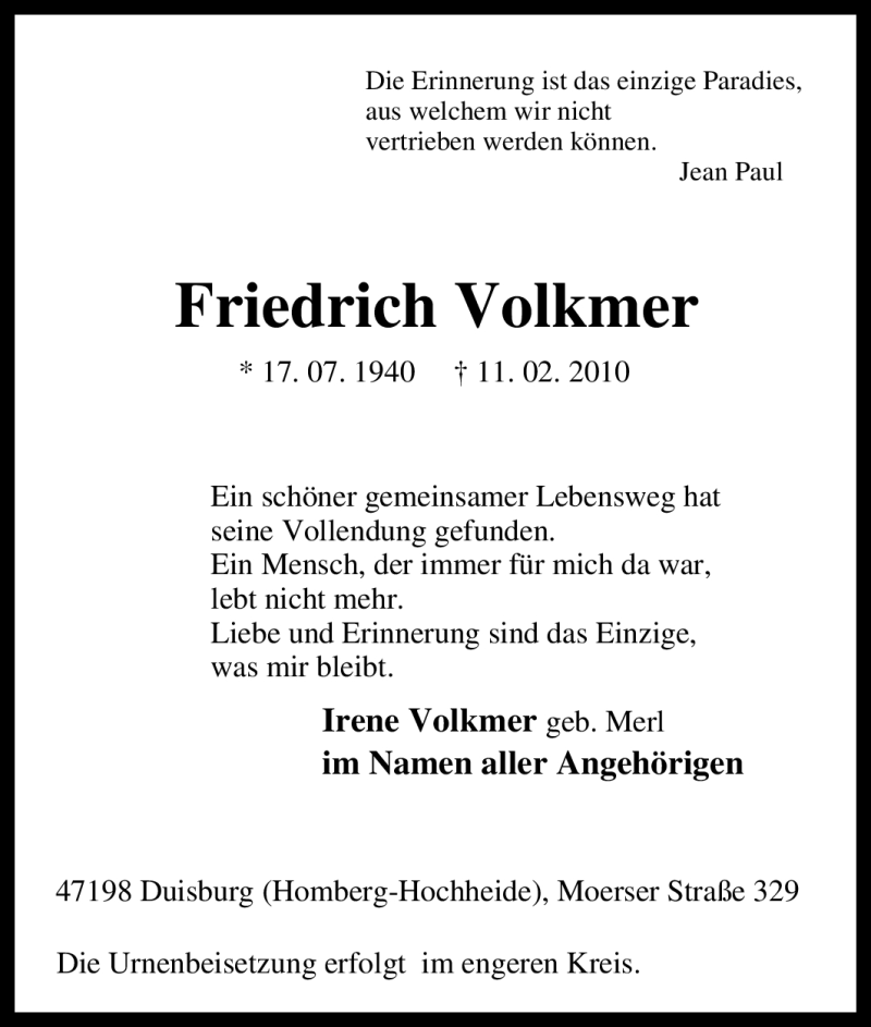 Hier finden Sie alle Traueranzeigen aus der Zeitung, die bisher für Friedrich Volkmer erschienen sind. Weitere Traueranzeigen, die in der Zeitung erscheinen, werden hier ebenfalls aufgelistet