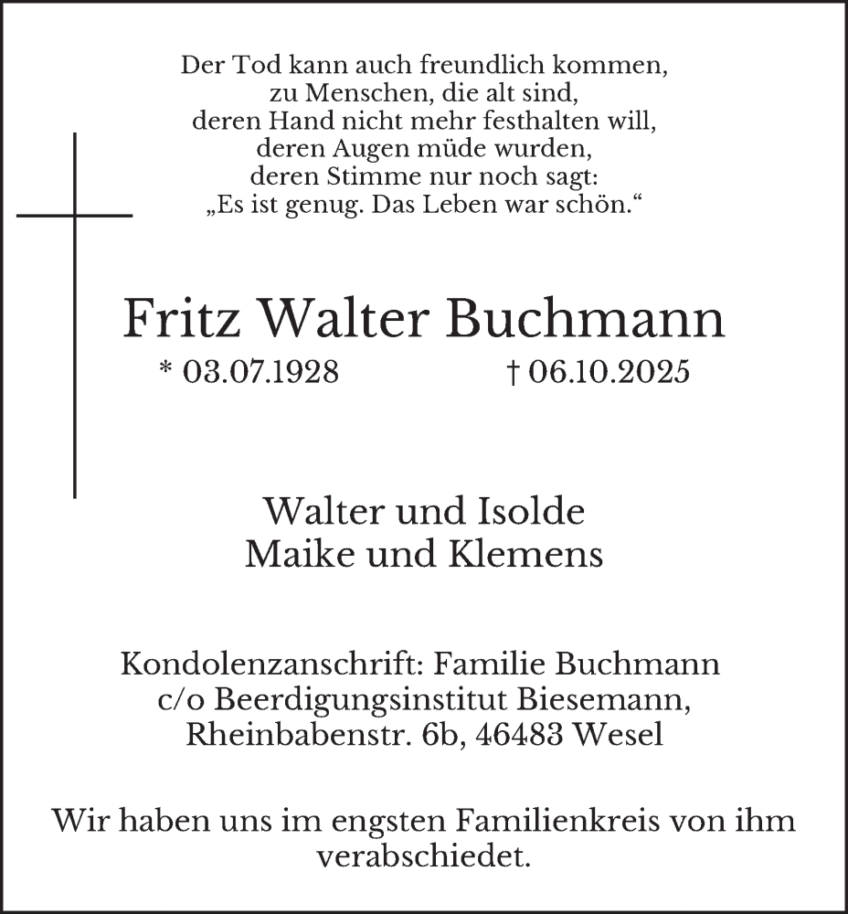 Hier finden Sie alle Traueranzeigen aus der Zeitung, die bisher für Fritz Walter Buchmann erschienen sind. Weitere Traueranzeigen, die in der Zeitung erscheinen, werden hier ebenfalls aufgelistet
