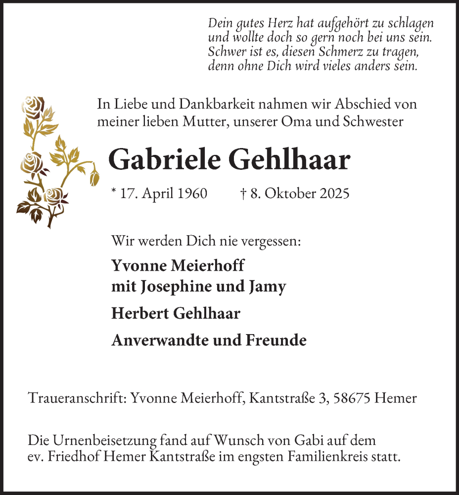 Hier finden Sie alle Traueranzeigen aus der Zeitung, die bisher für Gabriele Gehlhaar erschienen sind. Weitere Traueranzeigen, die in der Zeitung erscheinen, werden hier ebenfalls aufgelistet