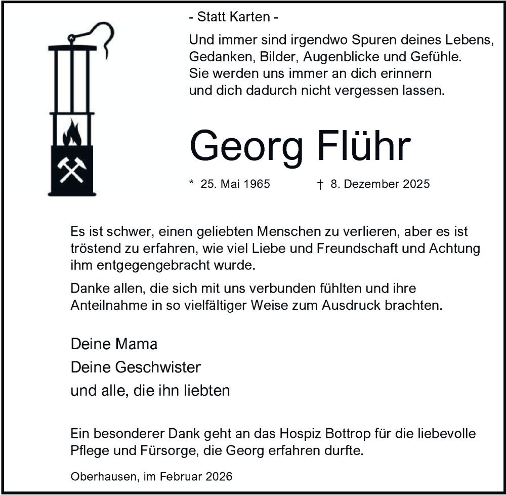 Hier finden Sie alle Traueranzeigen aus der Zeitung, die bisher für Georg Flühr erschienen sind. Weitere Traueranzeigen, die in der Zeitung erscheinen, werden hier ebenfalls aufgelistet