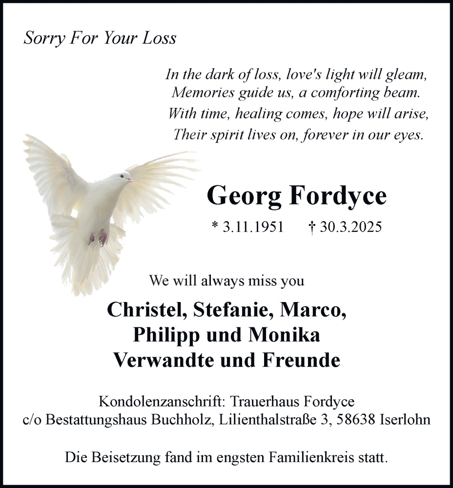 Hier finden Sie alle Traueranzeigen aus der Zeitung, die bisher für Georg Fordyce erschienen sind. Weitere Traueranzeigen, die in der Zeitung erscheinen, werden hier ebenfalls aufgelistet