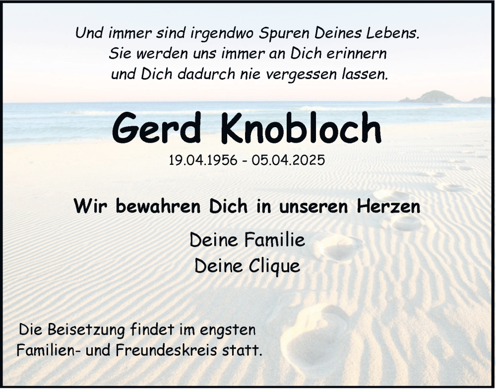 Hier finden Sie alle Traueranzeigen aus der Zeitung, die bisher für Gerd Knobloch erschienen sind. Weitere Traueranzeigen, die in der Zeitung erscheinen, werden hier ebenfalls aufgelistet