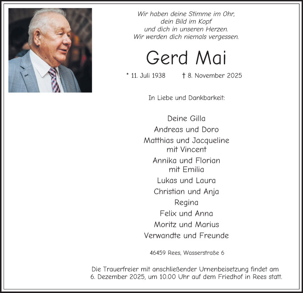 Hier finden Sie alle Traueranzeigen aus der Zeitung, die bisher für Gerd Mai erschienen sind. Weitere Traueranzeigen, die in der Zeitung erscheinen, werden hier ebenfalls aufgelistet