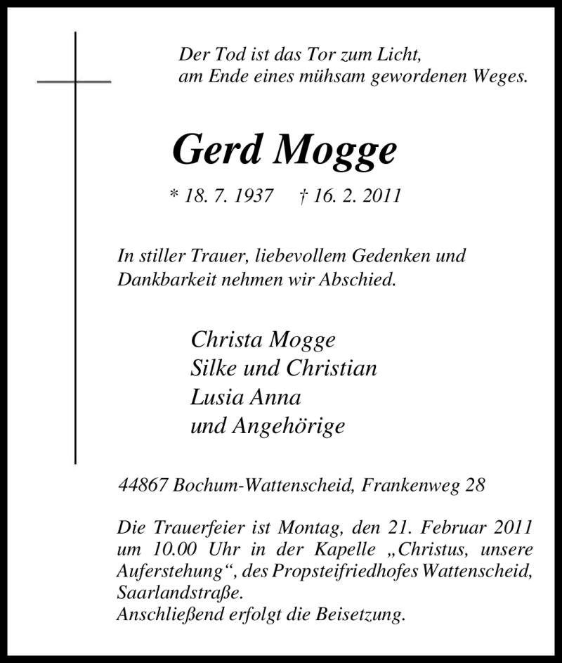 Hier finden Sie alle Traueranzeigen aus der Zeitung, die bisher für Gerd Mogge erschienen sind. Weitere Traueranzeigen, die in der Zeitung erscheinen, werden hier ebenfalls aufgelistet