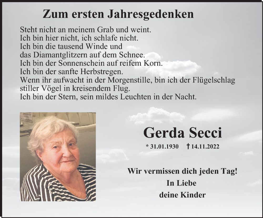 Hier finden Sie alle Traueranzeigen aus der Zeitung, die bisher für Gerda Secci erschienen sind. Weitere Traueranzeigen, die in der Zeitung erscheinen, werden hier ebenfalls aufgelistet