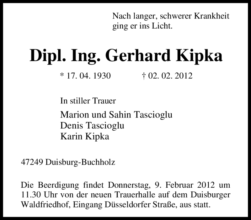Hier finden Sie alle Traueranzeigen aus der Zeitung, die bisher für Gerhard Kipka erschienen sind. Weitere Traueranzeigen, die in der Zeitung erscheinen, werden hier ebenfalls aufgelistet