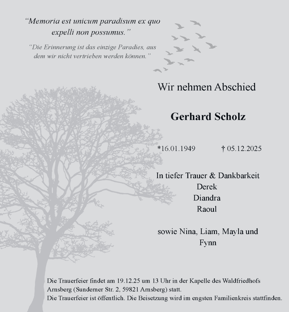 Hier finden Sie alle Traueranzeigen aus der Zeitung, die bisher für Gerhard Scholz erschienen sind. Weitere Traueranzeigen, die in der Zeitung erscheinen, werden hier ebenfalls aufgelistet